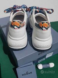 Hogan originali sneakers donna bianche con lacci fantasia floreale. Comodissime e di tendenza per distinguersi da tutte le altre sneakers. Qualità e ricercatezza tipiche del marchio Hogan. Scarpa taglia 39 1/2 indossate una sola volta. Perfette come nuove. Prezzo a negozio 380 euro. Complete di scatola e lacci di ricambio