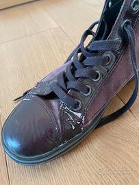 Stivaletto da donna viola con suola in gomma con parti in pelle lucida e parti in camoscio. Segni di usura sulle parti anteriori vicino alle punte. Matchio: Hogan. Misura: 37,5.