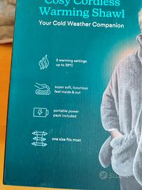 = Prodotto nuovo e mai utilizzato = Coperta / Scialle riscaldata indossabile di tessuto molto morbido, con 2 impostazioni di calore fino a 38°C, senza fili con powerbank incluso. Dimensione: 180cm x 60cm x 2cm.