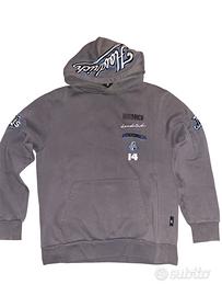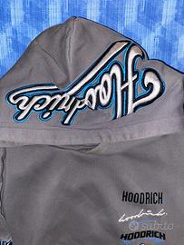 Felpa con cappuccio Hoodrich originale, colore grigio antracite/heather (super comfy e morbida!). Design unico con ricami premium: multipli 'HOODRICH' in nero e blu, script handwriting bianco 'hoodrich', numero '14' grande in bianco, emblema mani in preghiera (praying hands) con ali o dettagli blu – vibe streetwear/ritual iconica del brand UK!
