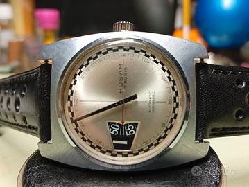 rarissimo e ricercato orologio saltarello Hosam anni 70 automatico (difficile da trovare perché prodotti sempre con carica manuale), con cassa oversize 40x36 di tipica forma di quegli anni, con lavorazione soleil a raggiera e lunetta lucida che fa da cornice allo spettacolare quadrante originale intonso argenté anch'esso con lavorazione soleil pista dei secondi a scacchi stile racing, finestra trapezoidale ad ore nove da cui si possono ammirare i dischi ore e minuti grafica bianca su fondo nero a contrasto e sfera secondi tipo crono laccata nera, perfettamente leggibili, calibro automatico su base AS 1953 con modifica dei dischi per l'indicazione dell'orario al posto delle lancette, perfettamente funzionante e controllato presso i nostri laboratori, Hosam era una delle tante e gloriose maison svizzere attive fino agli anni 80 che insieme ad altre come Enicar, Mulco, Wittnauer, Monvis, Dreffa... negli anni 80/90 hanno purtroppo chiuso per l'avvento dei quarzi giapponesi, testimonianza di una parte dell'industria svizzera di orologeria che non esiste più ma che continua ad arrivare a noi come appunto questo oggetto, in condizioni veramente ottime per l'età originale e coevo in ogni sua componente e per la difficoltà di reperibilità, oggetto di sicura rivalutazione investimento garantito.