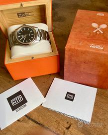 HTD Tennis Chic Velvet Black T23S01 Orologio automatico, Marzo 2026. Quadrante nero . Resistente all'acqua Custodia con fondello a vite e 100 mWR CASSA Acciaio inossidabile Diametro 37 mm 44 mm da ansa ad ansa Altezza 9 mm con vetro Lancette bombate lucide Colore acciaio naturale. Vetro Zaffiro piatto con doppio rivestimento antiriflesso. Movimento 28'800 bph 9039 movimento Miyota Premium