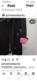 I CERBERG,sfizioso cappotto nero, chiusura con zip argentato targhetta. argentato rettangolare sulla parte destra dello stesso....il logo inciso per esteso su targhetta rettangolare. Fodera interna base fucsia con disegni colorati.Il Fucsia della Fodera da colore sulla base delle maniche...