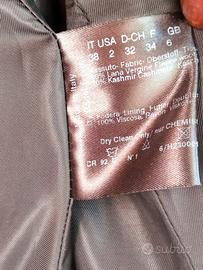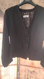 il giacchino corto, affiancato, foderato , il colore marone e nero. la stoffa molto elaborata. La gonna fatta a portafoglio, lunghezza 65 cm, TG I 42, USA 8 FR 38.