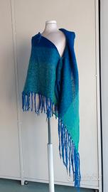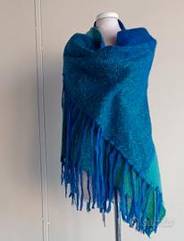Nato come scialle, il capo è stato trasformato in un fichu finito. Una cucitura strategica ne fissa il drappeggio, e ne avvolge le spalle. Grazie alla natura flessibile della lana tessuta a mano e alla sua nuova struttura chiusa, il capo vanta una vestibilità universale, adattandosi con eleganza a silhouette dalla taglia 40 alla 48. L'accostamento cromatico è un marchio di fabbrica: un blu profondo che incontra un verde smeraldo vibrante, in un gioco di contrasti tipico del genio creativo di Elisa Bellugi.