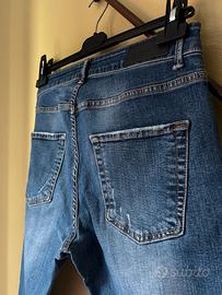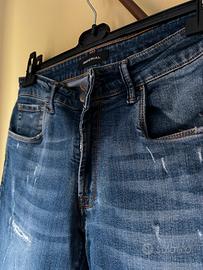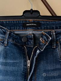 Vendo Jeans da uomo Imperial, modello "Tom" (codice 14094). Si presentano in un lavaggio denim blu medio con un moderno effetto "vissuto" e strappi (distressed) sul fronte e sulle tasche posteriori. Realizzati in Italia con un tessuto di qualità (99% cotone, 1% elastan), risultano leggermente elasticizzati e comodi.