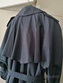 importanti fermate da laccetti, mantellina posteriore a pieghe, spacco , cintura da annodare, tasche con pattina chiusa da bottone.
