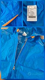 Giacca impermeabile blu elettrico Quechua Decathlon con dettagli e zip arancione. Una delle tasche funge da busta per ripiegare l'impermeabile. È leggero, un solo strato in poliestere. Occupa poco spazio, comodo da portare nello zaino in montagna.