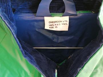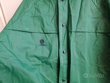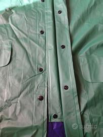 Impermeabile lungo, verde scuro all'esterno e blu all'interno, con cappuccio estraibile, doppia fila di bottoni, 2 tasche sul davanti, taglia XL, 100% PVC, mai indossato.