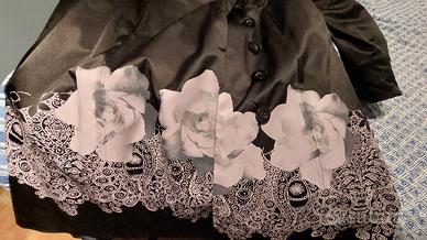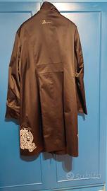 impermeabile nero Desigual con disegno floreale bianco sul fondo lunghezza 96 dalla spalla Taglia 46 /48 , chiusura con bottoni , tasche laterali e collo alla coreana