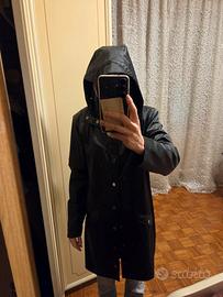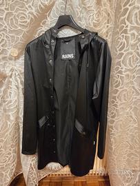 Impermeabile Rains antivento e pioggia nero lucido, 100% poliestere, tg xs, tasche laterali con bottoni a chiusura ermetica e chiusura centrale.