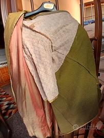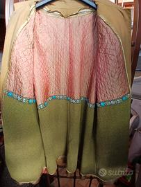 Impermiabile in perfette condizioni. Bellissimo capo con spalline taglio leggermente svasato con apertura sul davanti con bottoni. E tasche con taglio laterale. Il capo di abbigliamento ha un interno felpato completamente separabile color marrone e verde e all'altezza della cintola un ricamo di fiori. L'interno e attaccato con una cerniera lampo che se aperta lascia l'impermeabile in versione primaverile/ estiva rivestita con la fodera in perfette condizioni. Misure: larghezza spalle cm 54 lunghezza 100