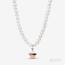 La collana (382489C01) è lunga 45cm in argento 925 e lega rame-argento placcata in oro Pietre preziose artificiali: circa 4 perle incastonate con zirconi sintetici trasparenti rotondi a taglio brillante; circa 44 perle Pendente a stella in lega di rame-argento placcato oro unico con pieghe leggermente rialzate sulla superficie per conferirgli l'aspetto di pieghe di carta; zirconi sintetici di varie dimensioni in un angolo; filo di perle attaccato a una catena in argento 925; chiusura laterale C'è un pendente a stella in argento originale 925, che è anche un disegno a stella origami con pieghe tridimensionali; un diverso pendente a stella in lega di rame-argento placcato oro è inciso con il logo Pandora sul retro. Nota: il ciondolo non è rimovibile; la collana è regolabile in tre lunghezze. Ispirazione: la tradizione delle stelle origami, note anche come stelle dei desideri. È fatto di strisce di carta piegate, che simboleggiano fortuna e benedizioni sincere.