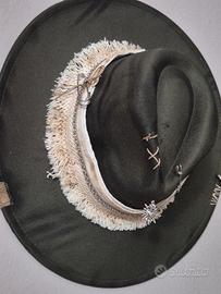 Cappello fedora a tesa larga in color verde militare scuro, customizzato in stile Boho-Luxe.