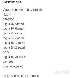 Vendo indumenti alta visibilità. Nuovi. Per le taglie vedere terza foto. Preferisco vendita in blocco. Valuto offerte per intero lotto.