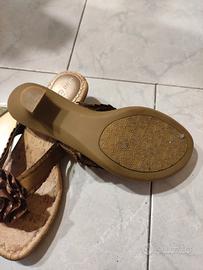 vendo infradito donna nuove,con possibilità di cambiare l'applicazione del fiocco e sostituirlo con quello verde che ho messo in foto,interno in sughero,suola e tacco unico corpo in gomma, l'altezza del tacco e 2/3 cm