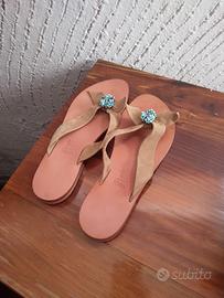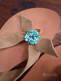 Meravigliosi infradito in pelle scamosciata e perle turchesi e argento. Usati due volte. Marca Rèves. Taglia 38. Pagati 95 euro. Meraviglia
