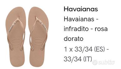 Vendo infradito Havaianas colore rosa dorato con logo argentato e brillantino. Acquistate per errore. Taglia 33-34. Nuove.