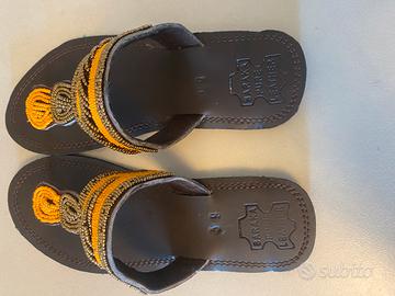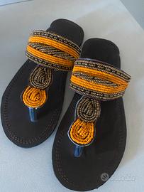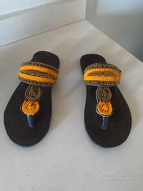 sandali infradito artigianali appoggiati su una superficie chiara. Sono realizzati con una base in pelle scura (probabilmente nera o marrone molto scuro), con cuciture visibili lungo il bordo. La parte superiore è molto decorata: * Le fasce che attraversano il piede sono rivestite da tante piccole perline. * I colori predominanti delle perline sono giallo/arancio acceso, argento e nero, disposte in motivi geometrici e ondulati. * Al centro, sopra la parte che passa tra le dita, c’è un elemento decorativo a forma di goccia, anch’esso ricoperto di perline con un disegno concentrico. Nel complesso, i sandali hanno uno stile etnico/artigianale, molto decorativo e vivace, con un forte contrasto tra la base scura e le perline luminose.