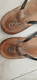 Sandali infradito Moda Positano, in pelle marroni con dettagli neri. Sono usati, ma in buone condizioni, presentano qualche segno di usura. Cinturini neri, taglia 40.