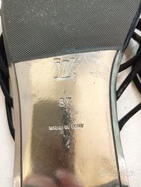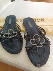 Infradito LV in camoscio nero con centrale gioiello in Swarovski raffigurante un fiore stilizzato, uno dei simboli di Louis Vuitton. Tacco basso e suola in gomma, non ricordo se è stata messa o era così, poiché sono stati inutilizzati da anni. Nelle foto purtroppo il colore sembra sbiadito mentre nella realtà è un bel nero carico, due pietre sono state sostituite poiché perse, sono leggermente più piccole ma indossati non si nota. Con il suo sacchetto da viaggio per riporle. Misura 37.