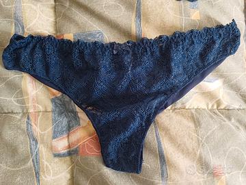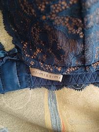 Bellissimo completino intimo Intimissimi, nuovo, di colore blu scuro. Indossato. - Reggiseno bralette con spalline tg. 3B - Brasiliana tg. 2. - Tessuto in pizzo elegante.