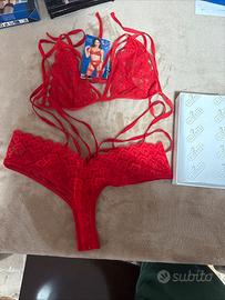 Intimo due pezzi in morbido pizzo rosso composto da reggiseno senza ferretto con coppe triangolari da legare al collo e sulla schiena abbinato ad una graziosissima culotte. Entrambi i pezzi sono caratterizzati ed abbelliti da stringhe elastiche che valorizzano le forme.