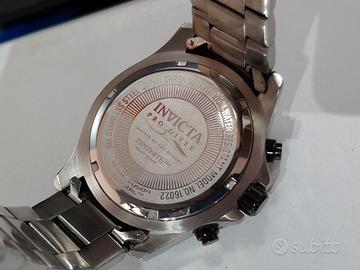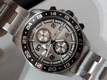 Vetro minerale, fondello a pressione firmato Invicta, impermeabilità dichiarata 100 metri. Bracciale originale in acciaio completamente satinato con chiusura deployante marchiata, lunghezza massima per polso circa 210 mm. Orologio usato in buone condizioni generali, normali segni da utilizzo ma senza urti evidenti.