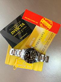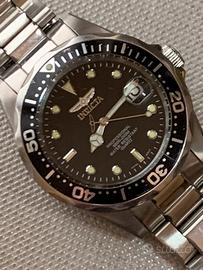 INVICTA Professional W.R.200M orologio subacqueo 20 BAR con movimento al quarzo e cassa di 38 mm adatta a polsi sia maschili che femminili - orologio in buono stato (presenza di vari segni superficiali di usura) - funzionamento perfetto - dotato di tutto il suo corredo originario (come visibile in foto) - quadrante nero con indici a pallettoni e lancette luminescenti - ghiera decimale in alluminio di colore nero girevole unidirezionale per immersioni subacquee - corona con logo - cristallo minerale - scritta Invicta sul fianco della cassa - bracciale inox originale di lunghezza massima completo di tutte le maglie con logo e marchio Invicta sulla chiusura - batteria nuova