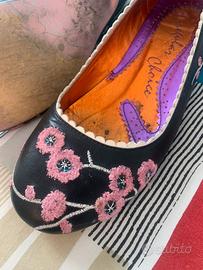 Vendo paio di scarpe Irregular Choice, numero 37, con elegante ricamo floreale rosa su fondo nero. Interno colorato e vivace, tipico del brand. Le scarpe presentano segni di usura sulla suola, ma sono ancora in buone condizioni estetiche e perfettamente indossabili. Ideali per chi cerca un tocco unico e creativo nel proprio look. Se le ritiri entro il 15 novembre sconto a 18 euro