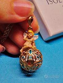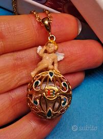 Catena a spirale torchon lunga (80cm) con splendido ciondolo chiama angeli con un putto alato seduto su una sfera traforata, al cui interno una pallina produce delicati tintinnii da campanellino. Punzone 925 situato accanto alla chiusura.