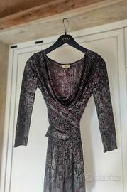 Splendido abito con collo a cascata, fusciacca in vita effetto wrapped per esaltare il punto vita, gonna morbida. Senza difetti. Chiusura lampo laterale. Fantasia geometrica / astratta. Taglia US 4 UK 8