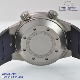 IWC Aquatimer 42MM con data in titanio, anno di produzione 2008, ghiera bidirezionale in titanio con inserto colore giallo e nero, vetro zaffiro antiriflesso, quadrante colore nero con data indici e sfere al luminova, movimento meccanico a carica automatica, cinturino in gomma colore nero con fibbia titanio originale IWC, più altro cinturino in gomma colore nero originale IWC nuovo ancora imbustato.