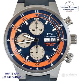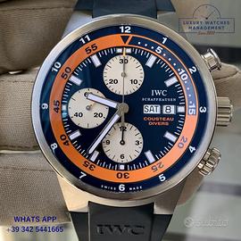 IWC Aquatimer 44MM cronografo Cousteau diver acciaio, anno di produzione 2007, ghiera liscia fissa in acciaio, vetro zaffiro antiriflesso, quadrante colore blu con giorno-data, tre contatori verticali colore argento, indici e sfere al LumiNova, movimento meccanico a carica automatica, cinturino in gomma colore blu con fibbia acciaio originale IWC.
