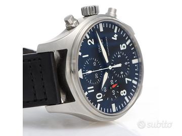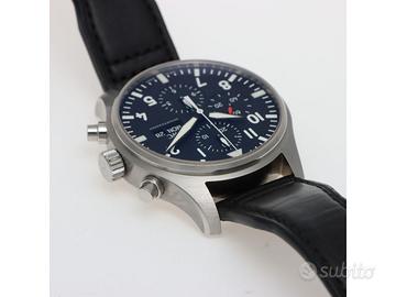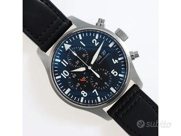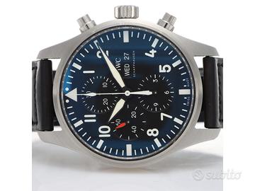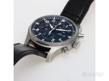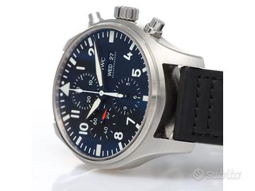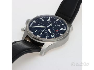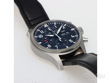IWC Pilot Chrono Ref. IW377709 realizzato in acciaio, Quadrante nero, Lunetta fissa in acciaio, cassa di diametro 43 mm. Corona di carica a vite in acciaio e pulsanti del crono in acciaio. Cinturino in pelle nera con chiusura ardiglione in acciaio firmata IWC. Orologio in condizioni eccellenti. Garanzia datata 07/2021.