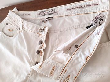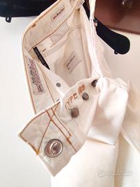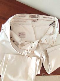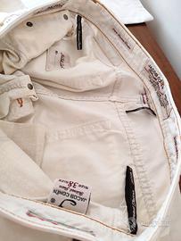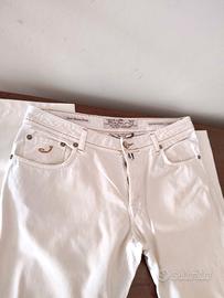 Pantalone cinque tasche, in cotone Jacob Cohen, colore bianco panna, chiusura con bottoni, salpa con logo in cavallino, impunture in contrasto. Questi pantaloni si distinguono per la ricercatezza dei dettagli, segno inconfondibile del brand