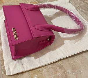 Borsa Jacquemus in pelle liscia color fucsia acceso, caratterizzata dall’iconico design minimal e strutturato del brand. Modello compatto con manico superiore rigido e chiusura frontale a patta, impreziosita dal logo Jacquemus in metallo dorato.