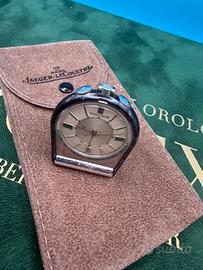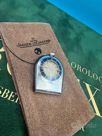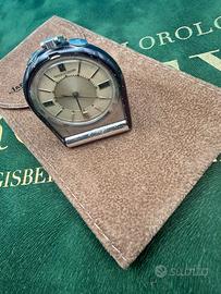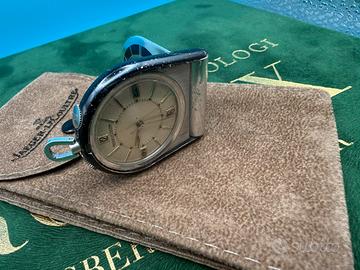 Splendido orologio vintage firmato Jaeger-LeCoultre, casa svizzera di altissima orologeria. Modello da tavolo / viaggio con cassa pieghevole compatta, ideale da portare con sé o da esporre. Design tipico anni ‘50–‘60, molto elegante e ricercato. Quadrante originale con logo Jaeger-LeCoultre, indici applicati e numeri arabi a ore 12, 3, 6 e 9. ⸻ ⚙️ Caratteristiche Tecniche •Marca: Jaeger-LeCoultre •Tipologia: Orologio da viaggio / tavolo •Movimento: Meccanico (carica manuale) •Funzioni: Ore, minuti (possibile funzione sveglia da verificare) •Cassa: Metallo cromato •Struttura: Pieghevole con supporto integrato •Quadrante: Originale, con patina del tempo •Corona: Superiore, per regolazione e carica ⸻ 📦 Accessori •Custodia originale Jaeger-LeCoultre in pelle scamosciata