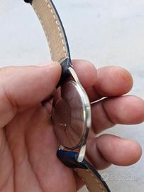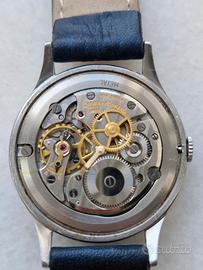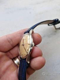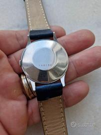 Vendo Jaeger-LeCoultre vintage 1956 referenza E264 con calibro di manifattura P450/4. Orologio 100% matching numbers con patina tropicale originale. CERTIFICAZIONI E NUMERI: - Referenza: E264 - Anno: 1956 - Seriale Cassa: 646036 - inciso su fondello esterno - Seriale Movimento: 106xxxx - inciso sul ponte - Numeri corrispondenti: Orologio tutto originale matching numbers DATI TECNICI: - Marca: Jaeger-LeCoultre, manifattura Le Sentier - Movimento: Cal. P450/4, 17 rubini, carica manuale, 18.000 A/h, firmato "Jaeger-LeCoultre Fab. Suisse" - Cassa: Acciaio inossidabile 35mm, anse curve tipo claw lugs, fondello a vite - Quadrante: Argento originale con patina tropicale naturale colore champagne/miele uniforme - Indici: Applicati misti numeri arabi e frecce triangolari - Lancette: Dauphine in acciaio con leggera ossidazione d'epoca - Vetro: Plexiglass bombato originale - Corona originale. CONDIZIONI E AUTENTICITÀ - VEDI FOTO: 1. Foto 2/6 Movimento: Cal. P450/4 di manifattura in condizioni eccellenti. Ponti decorati côtes de Genève, ruote dorate, viti azzurrate. Pulito, nessuna ossidazione. 2. Foto 5/6 Interno fondello: Marcatura "ACIER INOXYDABLE LECOULTRE CO SWISS" con perlage originale. Prova assoluta di cassa autentica JLC anni 50. 3. Foto 4/6 Esterno fondello: Seriale 646036 inciso. Il Cal. P450 è uno dei movimenti manuali più affidabili di Jaeger-LeCoultre, fornito anche all'esercito britannico. La patina tropicale sul quadrante è naturale e aumenta il valore del 25-30% rispetto a quadrante argento standard. FUNZIONAMENTO: Carica manuale fluida, marcia regolare testata. Riserva di carica circa 40 ore. Precisione entro -5/+10sec/giorno, normale per movimento anni 50 . CONDIZIONI ESTETICHE: Cassa con segni del tempo congrui, mai lucidata, mantiene spigoli vivi originali. Quadrante con patina affascinante e uniforme - non è difetto ma valore collezionistico. Vetro plexi con micrograffi superficiali. DOTAZIONE: Solo orologio.