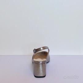 Scarpa con cinturino posteriore e fibbia. Tomaia in ecopelle color argento effetto opaco. Taglia 37. Tacco largo 5.5 cm. Nuovo senza cartellino.