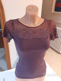 Janira - Maglia manica corta intimo donna in tulle strech con pizzo. Disponibile in blu (Tg. S,M,L,XL), viola (Tg. S,M,L), grigio fumo(Tg. S,L,M,XL) e nero (Tg. S,L,M,XL).
