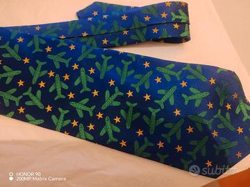 Cravatta fantasia anni 90 a firma Jean-Charles De Castelbajac- Nello stile immaginifico e vivacemente colorato che caratterizza il famoso designer francese, questa cravatta presenta aerei stilizzati verdi e stelle su un fondo blu brillante. Di grande effetto, giovane, allegra.