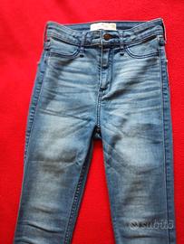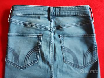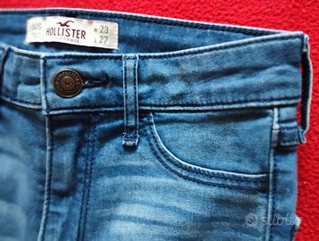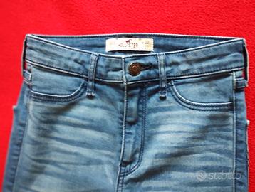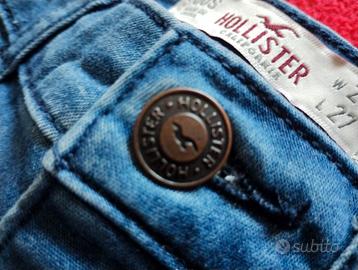 sportivo jeans elasticizzato a gamba diritta della Hollister. con bottone, cerniera e 4 tasche. colore blu chiaro. misto cotone, poliestere, elastane. taglia indicata W23 L27 che corrisponde ad una XS. vita 30 centimetri, lunghezza 92 cm. perfetto e senza il minimo difetto viene spedito lavato e stirato.