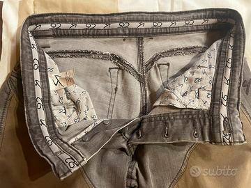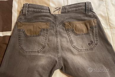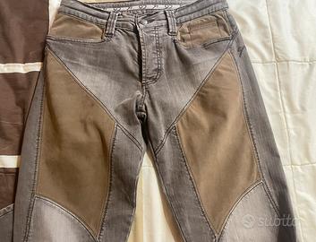 Causa cambio taglia, a malincuore, vendo bellissimi jeans, colore marrone, modello slavato ed elasticizzato, marca 9.2 Carlo Chionna, con toppe in alcantara, Tg 32, usati pochissimo, quindi praticamente come nuovi.