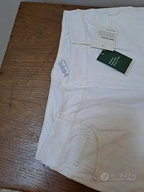 Jeans a sigaretta color panna molto elasticizzato, massima vestibilità, materiale resistente e 4 stagioni: non adatto a 40 gradi, ma per adattabilità al corpo utilizzabile d'estate e più caldo di leggins e collant pesanti in inverno. Taglio classico adatto a ogni occasione. 70% cotone indiano alta qualità, 25% poliestere, 5% elastane. Taglia indicata XL, misure prese da me: vita 42 cm, esterno gamba fino a caviglia 105 cm, interno gamba 72 cm, giro coscia altezza cavallo 29 cm, ricordo estrema elasticità materiale, tipo jeggins, ma jeans 5 tasche, zip e bottone. Troppo grande per me, spese di reso altissime. L'ho pagato 64 € più 15 di spese di spedizione, lo propongo a partire da 35 €, non trattabile al ribasso.