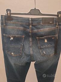 Jeans Amiri dal lavaggio scuro e un look vissuto.