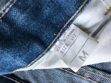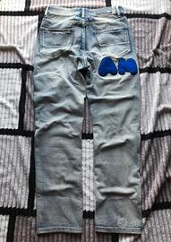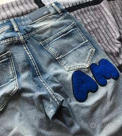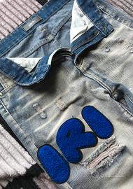 Vendo jeans ispirati allo stile AMIRI, con patch in spugna blu che compongono la scritta AMIRI tra parte frontale e posteriore. Il capo presenta un design urban di forte personalità: lavaggio chiaro effetto vintage, dettagli strappati, cuciture a vista e stile distressed pensato per chi vuole distinguersi.