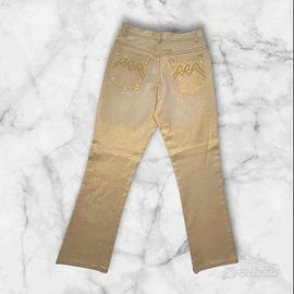 Splendido paio di jeans firmati Angelo Marani, un vero capo vintage di alta moda italiana. Il tessuto denim è caratterizzato da una particolare spalmatura dorata laminata che dona una lucentezza metallica incredibile, perfetta per non passare inosservata.