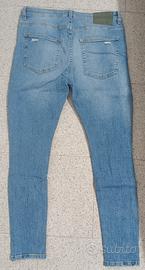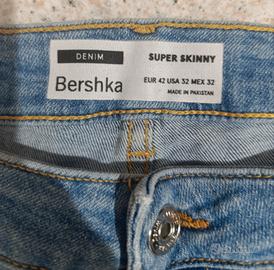 Jeans Bershka super skinny, taglia L (EUR 42, USA 32, MEX 32). Sono in denim di colore azzurro chiaro e presentano alcuni strappi sul ginocchio. - Modello aderente. - Made in Pakistan.