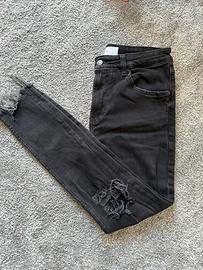 Jeans Bershka in colorazione nero. Il modello è caratterizzato da un forte stile streetwear grazie alle ginocchia squarciate e all'orlo a taglio vivo (frayed hem) molto sfrangiato, vestibilità skinny/slim.